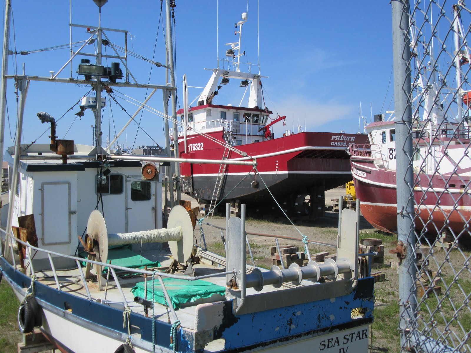Riviere-au-Renard is the largest commercial fishing port in Atlantic Canada. There was a very large fleet of fishing trawlers, a fish processing plant and a large fleet of trucks coming and going. Through the afternoon, there was a 20 knot + wind roaring through the harbour. Locals were very helpful with our docking at the recreational boat docks which share a large basin with the commercial fishing fleet. It was very interesting to walk the commercial pier and see all the activities that are the life blood of this village.